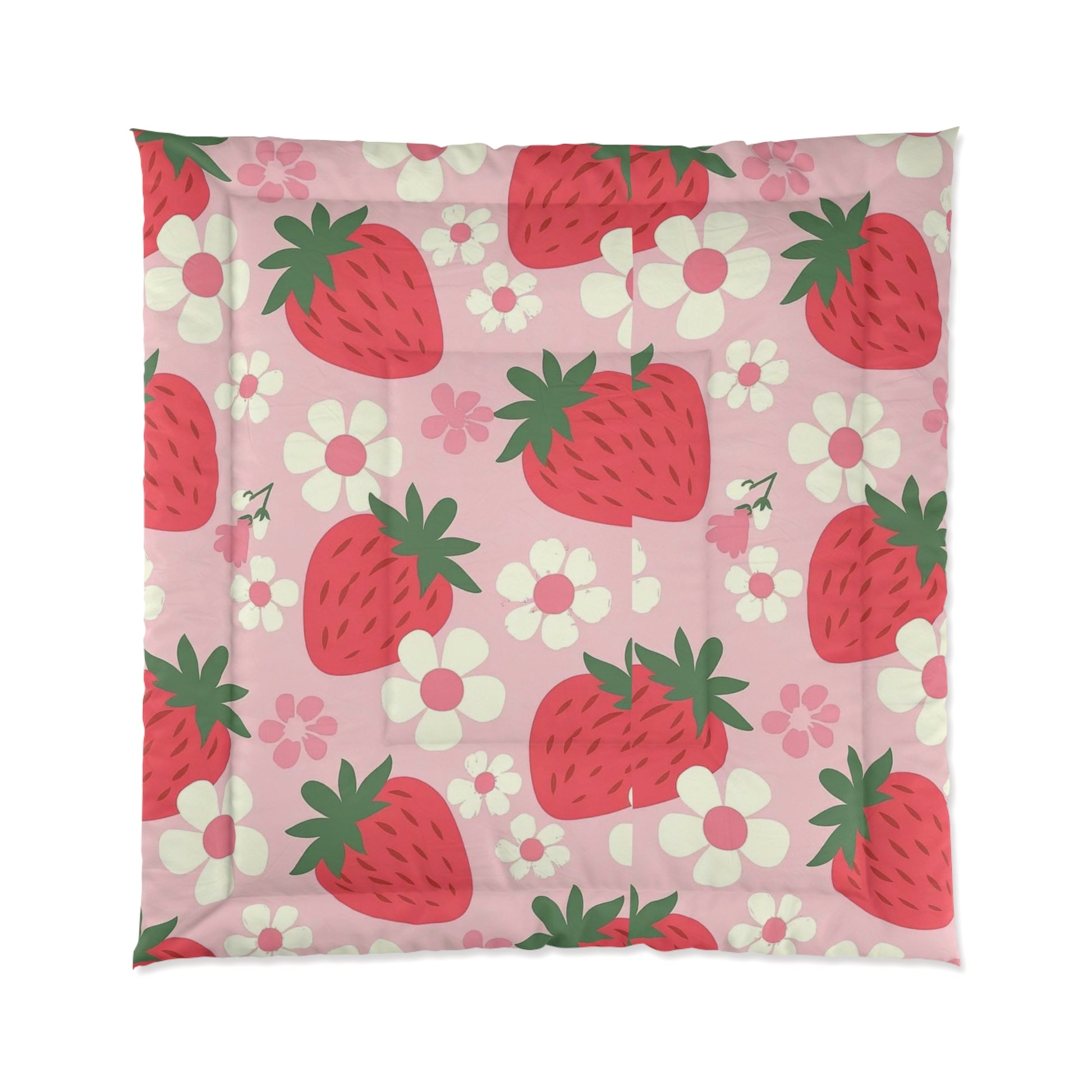 Strawberry Bloom Bedding Set – Pink Comforter with Red Strawberries & Flowers